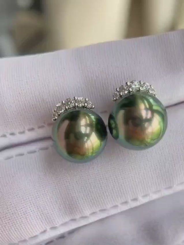 • Pearls: Premium Tahitian pearls in peacock green (one flawless, one with an extremely minor imperfection)